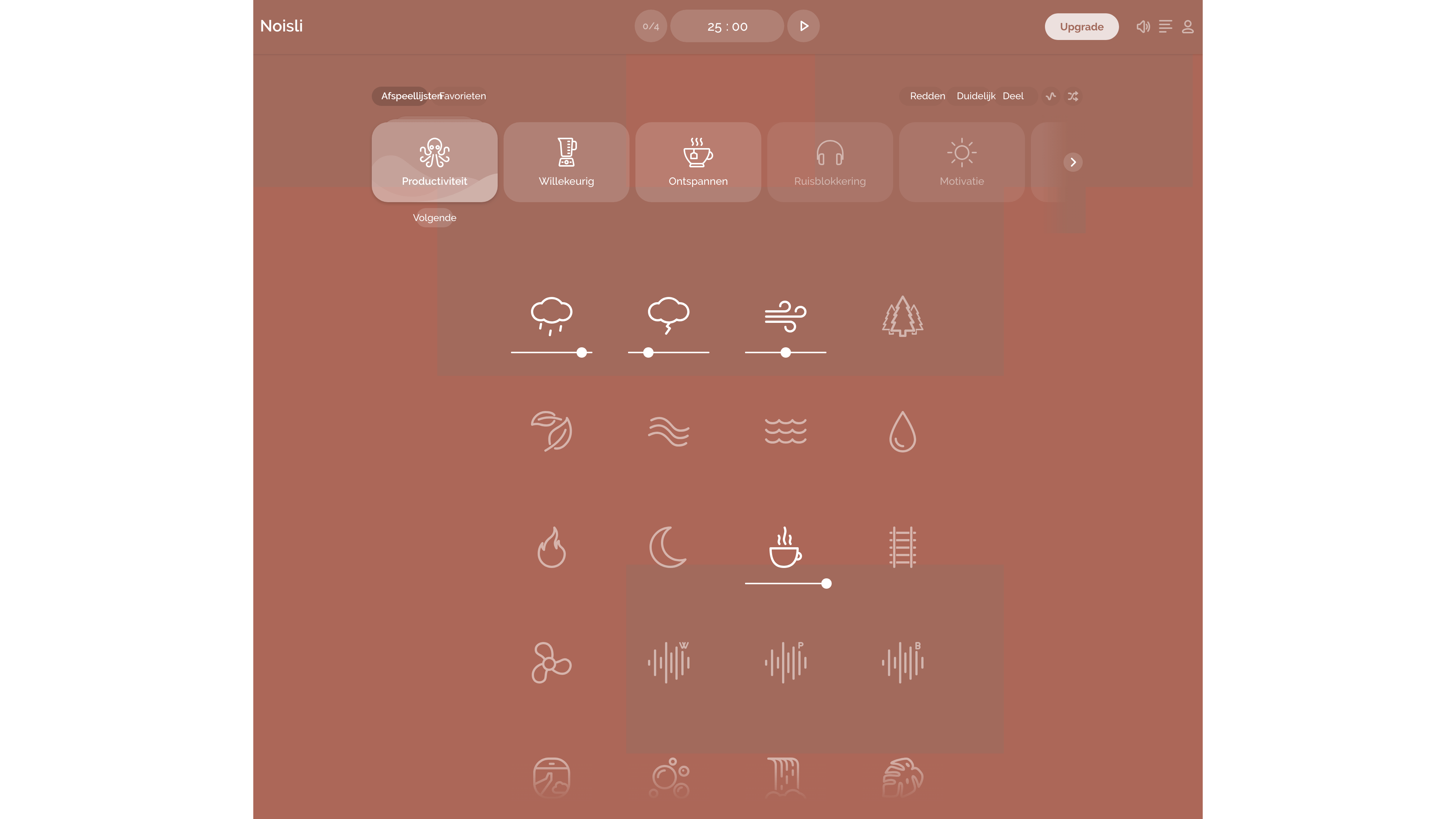 Omdat onze geest niet gemaakt is om acht uur na elkaar te focussen, volgt Noisli de natuurlijke aandachtsboog bij volwassenen die rond de twintig minuten ligt. De timer van deze toepassing verdeelt daarom je werkdag in sessies waarbij je concentratie op scherp moet staan en daartussen staan telkens korte pauzes. Het basisabonnement is gratis, en een Pro-lidmaatschap kost 10 dollar per maand. Met de Pro-versie kun je bijvoorbeeld achtergrondruis wegfilteren.