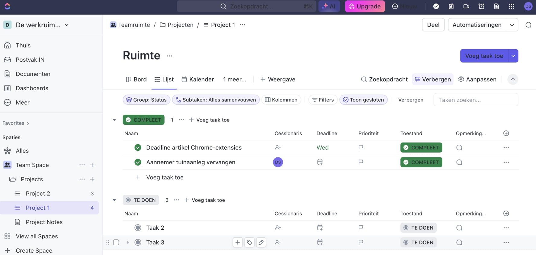Eerst moet je inloggen en bevestigen via e-mail. Daarna doorloop je een heleboel schermen om allerlei opties in te stellen, maar dat kan later ook nog. Eventueel kun je de teammodule activeren om met anderen samen te werken. Daarna selecteer je een werkruimte waarin je taken onderbrengt die je koppelt aan een kalender. ClickUp is een bijzonder uitgebreide projectmanager die je ook kunt inzetten voor tijdsregistratie.