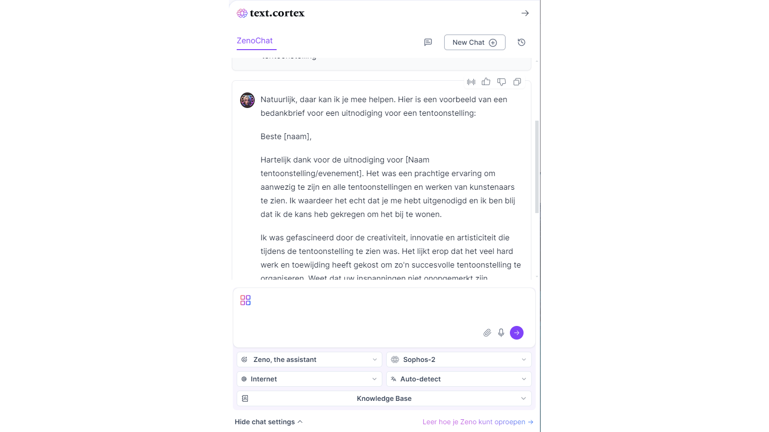 Wie niet gemakkelijk uit zijn woorden komt, kan zich laten helpen door een AI-tekstassistent. TextCortex is een hulpmiddel voor wie e-mails voor persoonlijke of professionele doeleinden maakt. De tool versnelt het schrijfproces voor je website, je online shop en socialmediaplatforms. Je stelt deze copilot in de juiste taal in en daarna geef je Zeno, de assistent, opdrachten. De tool kan ook je gedachten herformuleren en de tekst herschrijven.