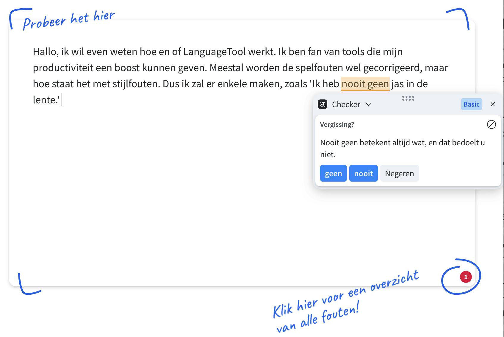 Schrijf je regelmatig via de browser in Twitter, Facebook, Google Docs of Gmail? Laat je creativiteit de vrije loop en daarna controleert Language Tool de tekst. De tool haalt er natuurlijk de spelfouten uit, maar hij ziet ook eventuele stijlfouten, zoals dubbele ontkenningen, pleonasmen of foutieve bijzinnen. Bij spelfouten verschijnt er een rode streep onder de tekst en bij stijlfouten is de markering paars. Als je op zo’n markering klikt, geeft LanguageTool suggesties voor de verbetering.