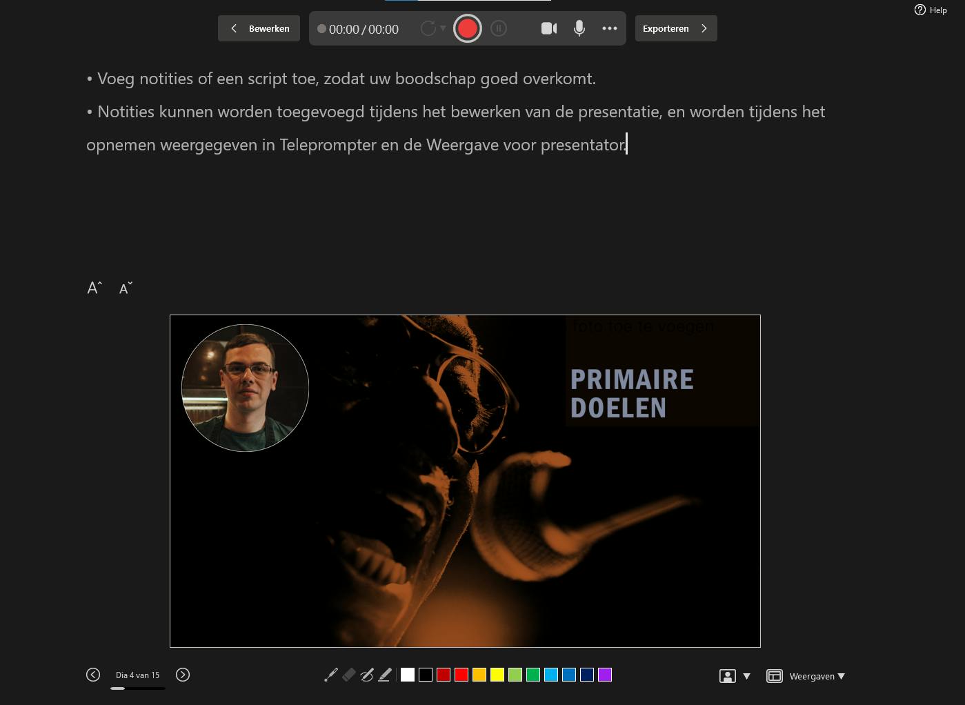 Vervolgens klik je recht bovenaan op de knop Opnemen en dan kom je in de donkere modus waar je de opname kunt starten en stoppen. Hier is het trouwens ook mogelijk de juiste camera en de microfoon te selecteren. En op die manier plaats je de opname op iedere dia waar je maar wilt.