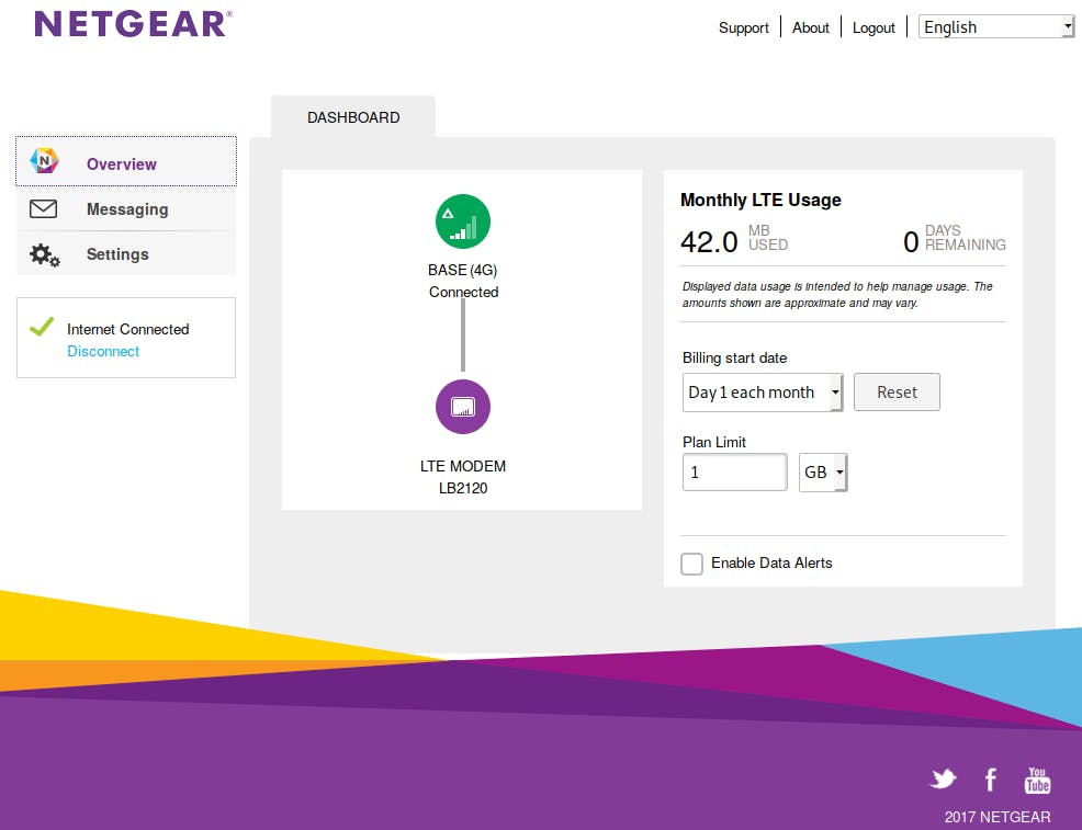 We tonen hier hoe dat gaat met de Netgear LB2120. Steek de simkaart in het micro-simkaartslot aan de onderkant, sluit de lan-poort aan op een ethernetpoort van je pc en start het modem op. Het modem deelt via dhcp een ip-adres uit aan je computer. Ga naar http://192.168.5.1, log in met het standaardwachtwoord dat onder op je modem vermeld staat en stel je APN in. Klik dan links op Connect om met het mobiele netwerk te verbinden. Daarna krijg je de sterkte van het signaal te zien aan de hand van de leds boven op je modem.