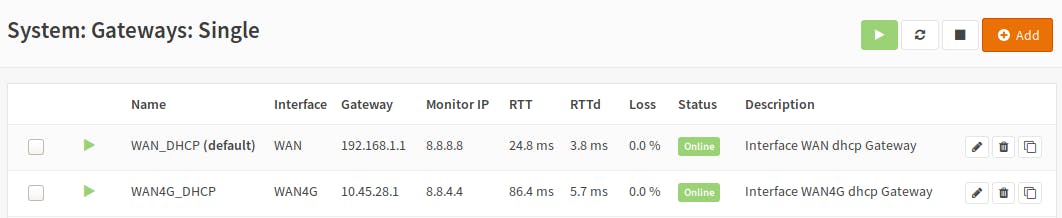Doe nu hetzelfde voor de gateway van je 4G-verbinding, verifieer deze keer ook dat Default Gateway zeker niet aangevinkt is (want dat houden we voor onze primaire verbinding) en vul als Monitor IP bijvoorbeeld 8.8.4.4 in. Sla je wijzigingen op. Na een druk op Apply changes krijg je de status van je gateways te zien. Als de vertraging (‘latency’) van je 4G-netwerk bijvoorbeeld hoog ligt, krijg je in de kolom Status een waarschuwing in het oranje. Zodra OPNsense het gemonitorde ip-adres niet meer kan bereiken via een gateway, komt in deze kolom bij de gateway in het rood Offline te staan.