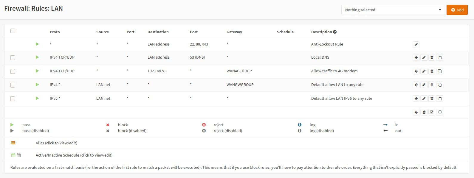 Er is nog één probleem: als je de OPNsense-machine zelf als dns-server gebruikt, wordt het verkeer van de lan-clients naar de OPNsense-machine door bovenstaande firewallregel ook naar de gatewaygroep gestuurd, en dat is niet de bedoeling. Voeg dus in Firewall / Rules / LAN met een klik op Add bovenaan rechts een nieuwe firewallregel toe.