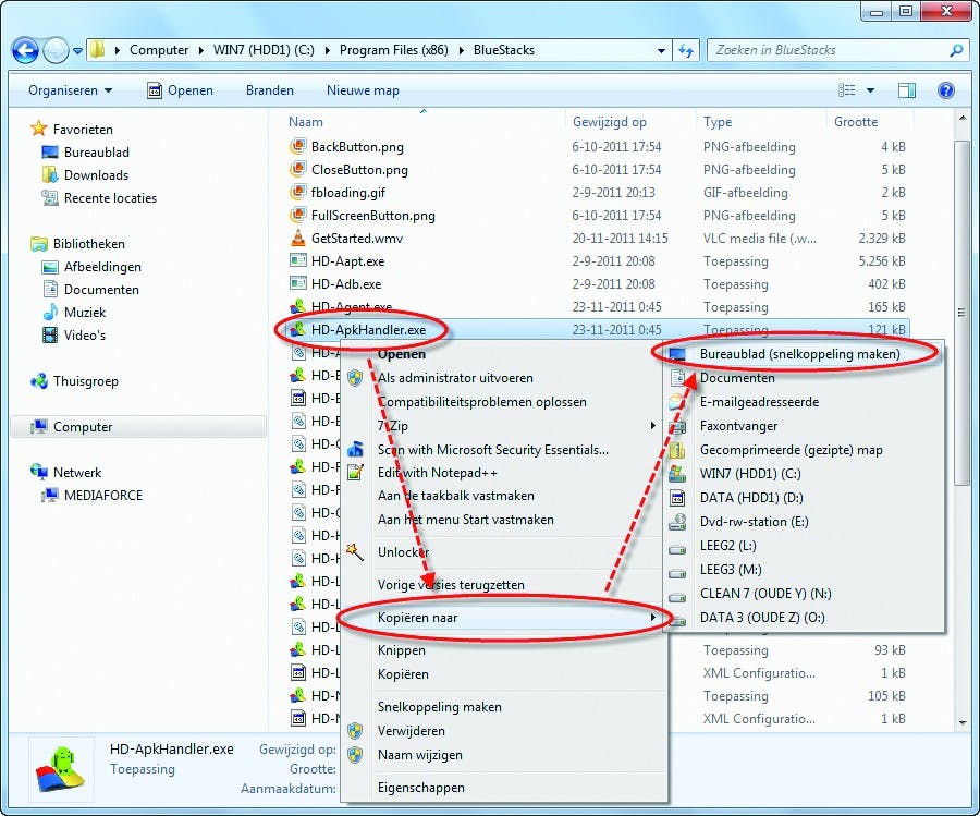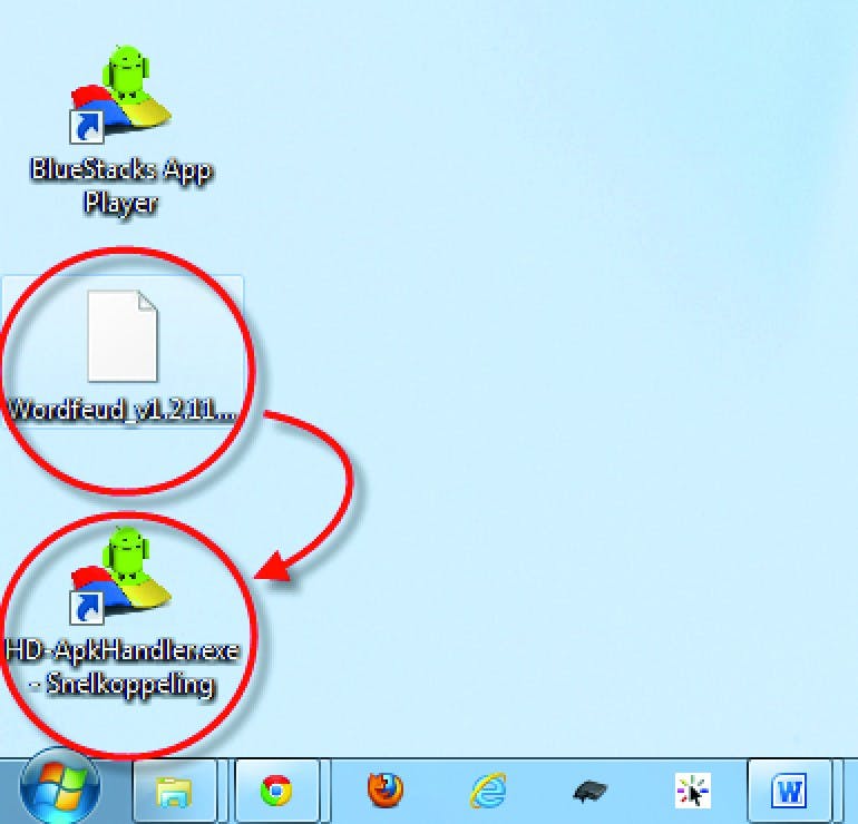 Nu wordt het even wat minder gebruiksvriendelijk. Er is (nog) geen mogelijkheid in de BlueStacks App Player om apps eenvoudig toe te voegen. Heel ingewikkeld is het gelukkig ook niet. Start de verkenner (Windowstoets + E) en blader naar de map C:\Program Files\BlueStacks (of C:\Program Files (x86)\BlueStacks als u de 64 bit-versie van Windows 7 gebruikt). In deze map ziet u het bestand HD-ApkHandler.exe. Hiermee kunt u nieuwe apps installeren in de App Player. Om het eenvoudiger te maken om Wordfeud (en eventuele andere apps) te installeren, maakt u een snelkoppeling naar dit bestand aan op uw bureaublad.