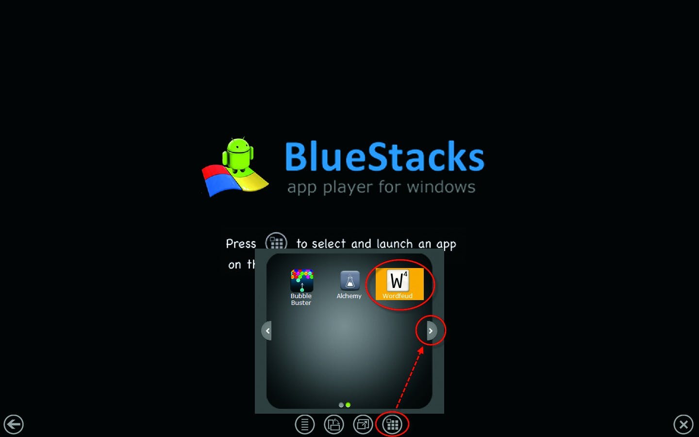 Als alles juist is geïnstalleerd, hebt u nu een snelkoppeling op uw bureaublad met de naam BlueStacks App Player. Dubbelklik deze snelkoppeling om de applicatie te starten. Zoals u ziet start het programma in een volledig scherm. Er zijn zes knoppen onderaan het venster, als u uw muiscursor op een knop plaatst verschijnt de uitleg voor die knop. In de BlueStacks App Player is al een aantal apps voorgeïnstalleerd. Om het menu met apps te openen, klikt u op meest rechter van de vier middelste knoppen. Het starten van apps is vervolgens een kwestie van eenmaal op de app klikken. Om in een app een stap terug te gaan, klikt u linksonder op de pijlknop. Als u de BlueStacks App Player wilt afsluiten, klikt u rechtsonder op het knopje met het kruis. Zoals gezegd kunt u met de BlueStacks App Player apps gebruiken die voor het Android-platform zijn geschreven. De Wordfeud-app is er een van, maar deze moet u nog wel eerst downloaden en installeren.