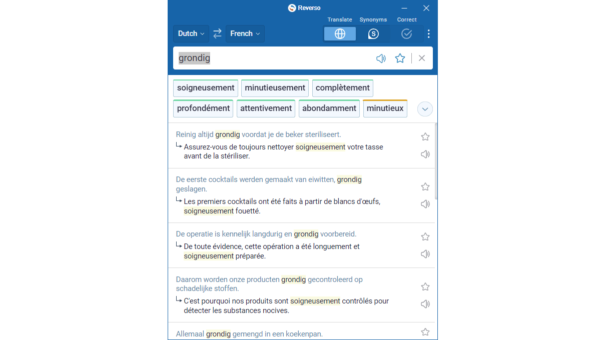 De mobiele app (iOS, Android) van Reverso biedt meer mogelijkheden dan die van Linguee, zoals gepersonaliseerde leerspelletjes en offline leren. Na een proefperiode is de iOS-app helaas niet meer gratis (3,99 euro per maand). Er is ook een Windows-app beschikbaar waar je zelf woorden kunt invoeren voor vertaling en synoniemen kunt opvragen. Je kunt ook vertalingen van grote stukken tekst rechtstreeks vanuit webpagina’s of Windows-applicaties laten uitvoeren met de sneltoets Ctrl+C+C. Met een gratis registratie verwijder je de beperking tot vertalingen van maximaal 450 woorden in één keer, maar hiermee betreden we volop het terrein van machinevertaling.
