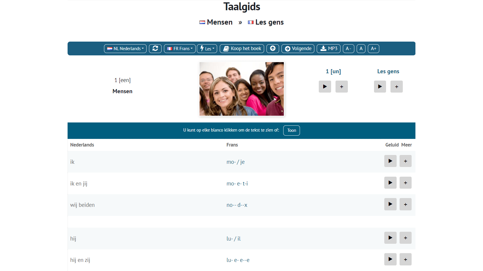 Elke les bestaat uit ongeveer twintig korte zinnen waarbij in de doeltaal alleen de eerste letters van elk woord zichtbaar zijn. Luister naar de ontbrekende woorden en vul ze aan. Je hebt ook de mogelijkheid om de uitgesproken uitdrukkingen als mp3-bestanden te downloaden. Daarnaast biedt de website voor elk talenpaar een geheugenspel waarbij de woorden op omgedraaide kaarten ook uitgesproken kunnen worden.