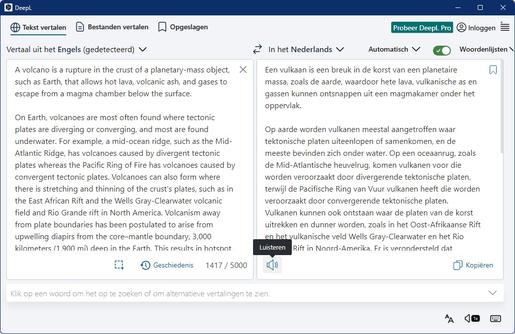 In de gratis versie ben je wel beperkt tot maximaal 3 bestanden per maand van maximaal 5 MB elk of tot vertalingen van 5000 tekens. Je kunt natuurlijk je teksten wel zelf opsplitsen en in behapbare brokken aan de vertaaldienst doorspelen. DeepL Pro verlost je van dergelijke beperkingen, maar kost je wel 7,49 euro per maand.