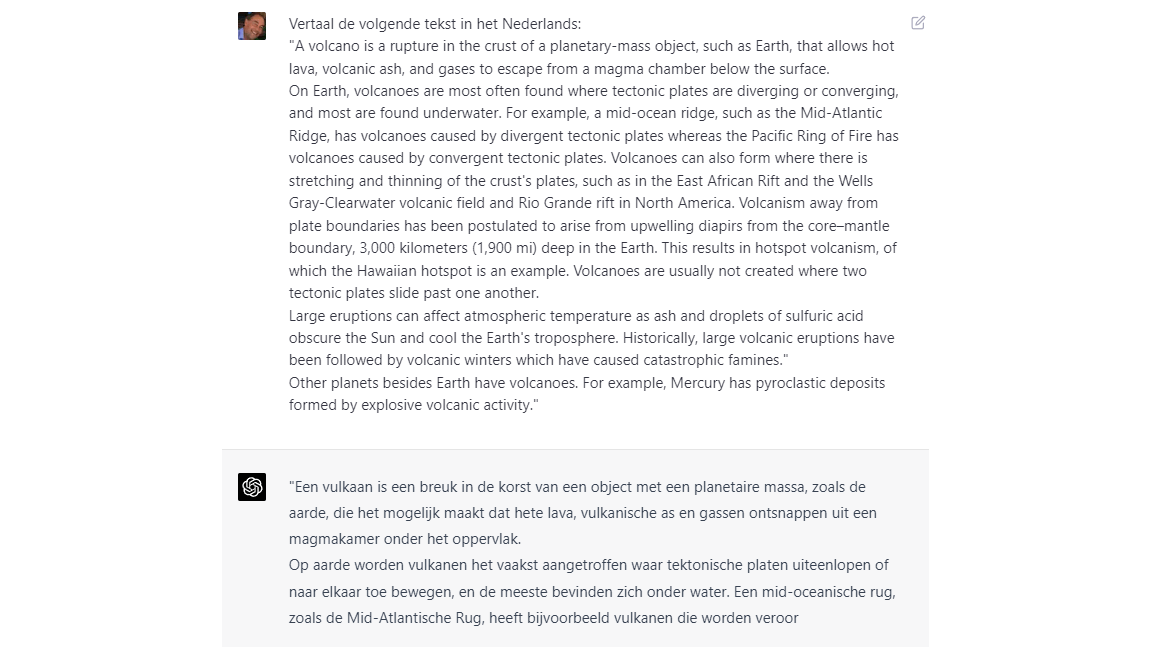 Overigens kun je de prompt direct in de gewenste doeltaal formuleren, eventueel aangevuld met de instructie ‘Formuleer je antwoord in [deze taal]’, maar aangezien de chatbot voornamelijk met Engelstalige datasets is getraind, krijg je vaak betere resultaten door eerst in het Engels te vragen en daarna de chatbot te verzoeken het resultaat in de gewenste doeltaal te vertalen. Als alternatief kun je het antwoord plakken in een vertaaldienst zoals DeepL, Google of Bing, aangezien deze diensten doorgaans (vooralsnog) net iets beter presteren.