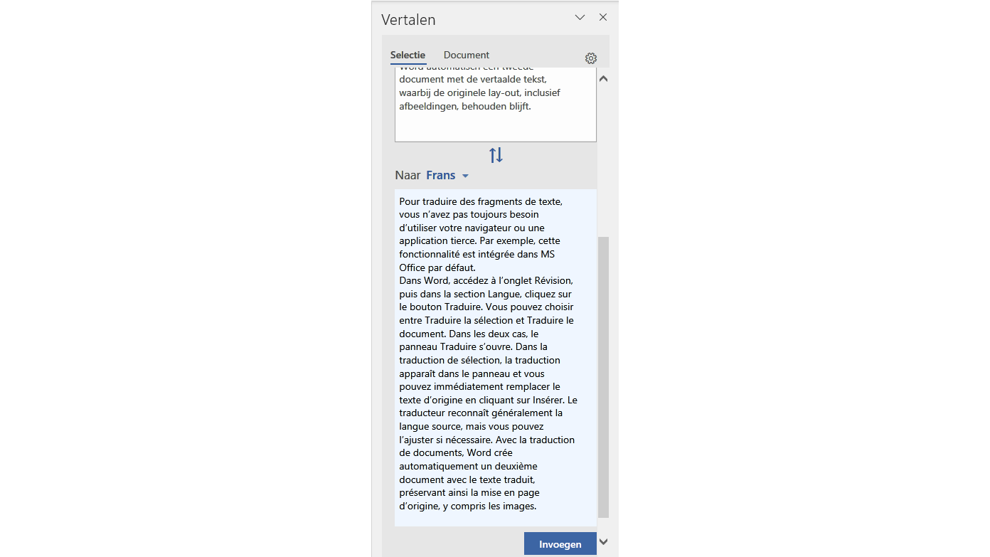 In Word navigeer je naar het tabblad Controleren en klik je in de sectie Taal op de knop Vertalen. Je kunt kiezen tussen Selectie vertalen en Document vertalen. In beide gevallen opent het deelvenster Vertalen. Bij selectievertaling verschijnt de vertaling in het deelvenster, en je kunt de originele tekst direct vervangen door op Invoegen te klikken. De vertaler herkent meestal de brontaal, maar je kunt dit indien nodig aanpassen. Bij documentvertaling maakt Word automatisch een tweede document met de vertaalde tekst, waarbij de originele lay-out, inclusief afbeeldingen, behouden blijft.