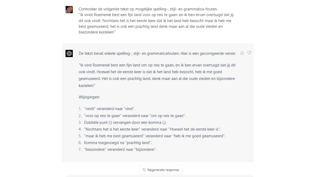 Je kunt ook een AI-chatbot als ChatGPT inzetten. Met de juiste prompts kan zo’n bot je taal en stijl verbeteren en zelfs aanpassen naar een bepaalde schrijfstijl. Probeer gerust prompts als ‘Controleer deze tekst op mogelijke spelling-, grammatica- en stijlfouten’, ‘Herschrijf deze tekst in een formele stijl’ of ‘Herschrijf deze tekst zodat 10-jarigen deze ook goed begrijpen’.