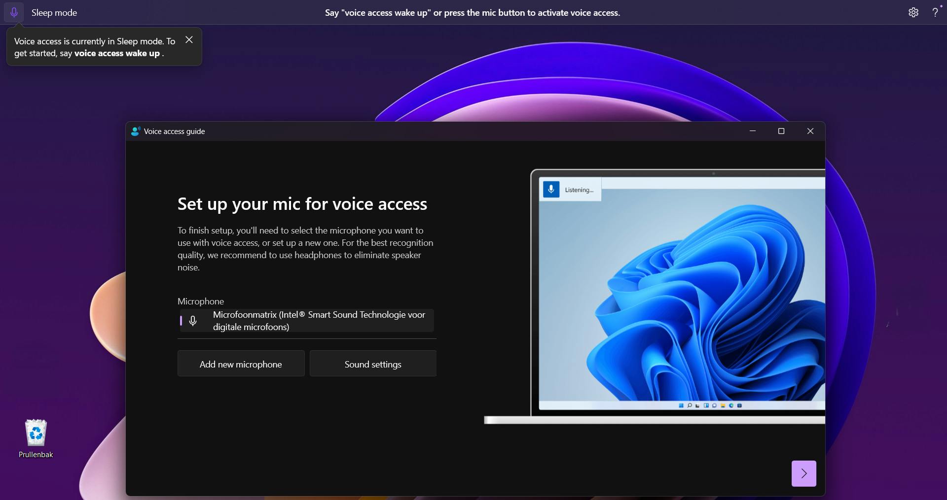 Een grote beperking van deze app is dat hij nog steeds alleen Engelse taalvarianten ondersteunt, zelfs in Windows 11. Wanneer je de app activeert, zie je bovenaan het beeldscherm een horizontale balk. In deze balk lees je dat Voice access nog in de slaapmodus is. Om de functie wakker te maken zeg je Voice access wake up of klik je op de microfoonknop.