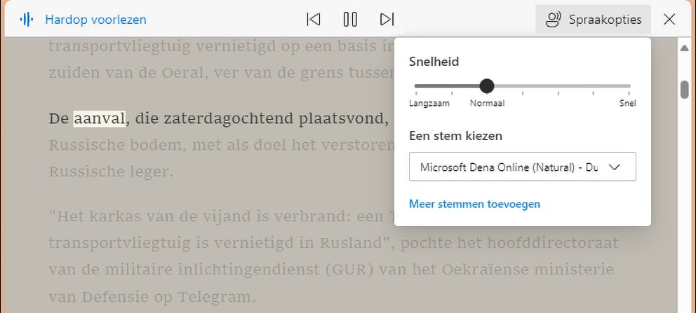 Ook sommige browsers hebben een voorleesfunctie. In Edge start je deze met Ctrl+Shift+U of via Instellingen en meer / Meer hulpprogramma’s. Of je activeert de functie Insluitende lezer met F9. Voor Firefox en Chromium-browsers kun je een extensie als Read Aloud installeren, beschikbaar in de officiële webstores.