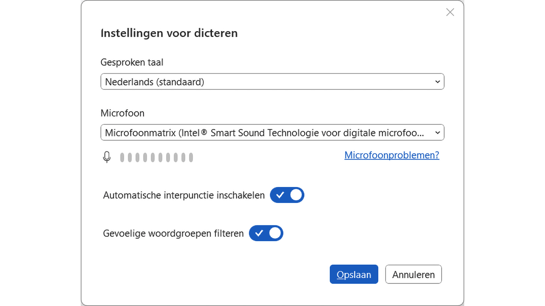 Op het scherm verschijnt een klein venster met een microfoon waarmee je ziet dat Spraakinvoer actief is. Links van het microfoonpictogram staat een tandwieltje om de instellingen aan te passen. Je kunt zo onder meer een andere microfoon selecteren. Standaard plaatst deze tool de leestekens op basis van je intonatie. Je kunt ook interpunctie dicteren zoals: punt, enkel aanhalingsteken open, enkel aanhalingsteken sluiten, komma, beletselteken en dubbele punt.