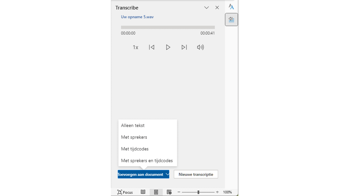 Een andere bijzondere manier van spraakinvoer die we terugvinden in Word is de optie om gesproken tekst netjes te transcriberen. Word tovert dan de audio om in getypte tekst, met tijdcodes. Bovendien maakt de transcriptie onderscheid tussen de verschillende sprekers. Deze optie werkt in de Windows-versie, maar niet in de macOS-variant. Die laatste groep kan wel de online versie van Microsoft 365 gebruiken, want daar functioneert de transcriptiefunctie zelfs beter.