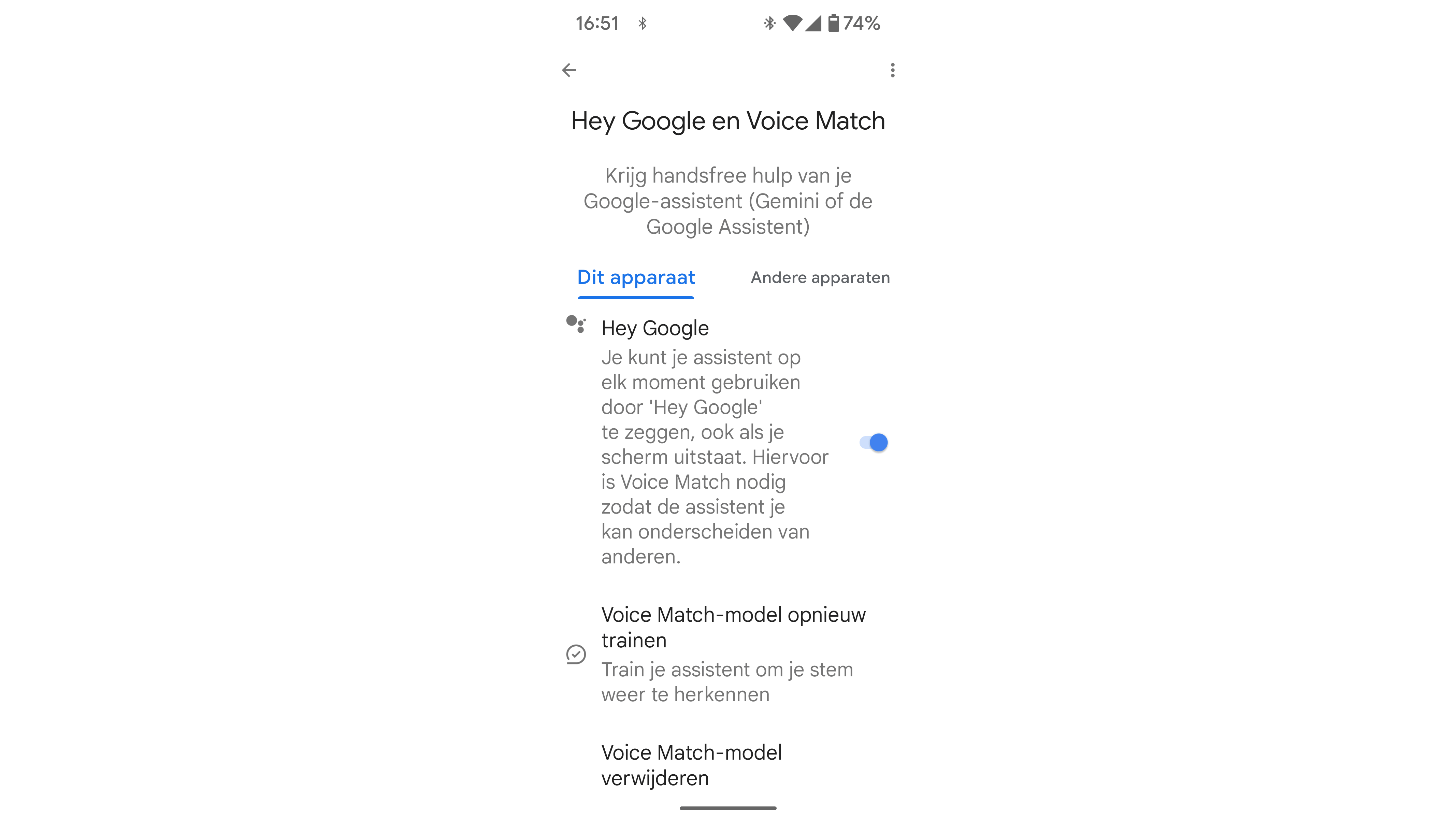 In de instellingen kun je bij Languages ondersteunde talen als Nederlands (Nederland), Nederlands (België) en/of English (United States) selecteren. Indien gewenst kun je ook (Assistent responses on) Lock screen activeren; test dan wel even of de app alleen op jouw stem reageert.