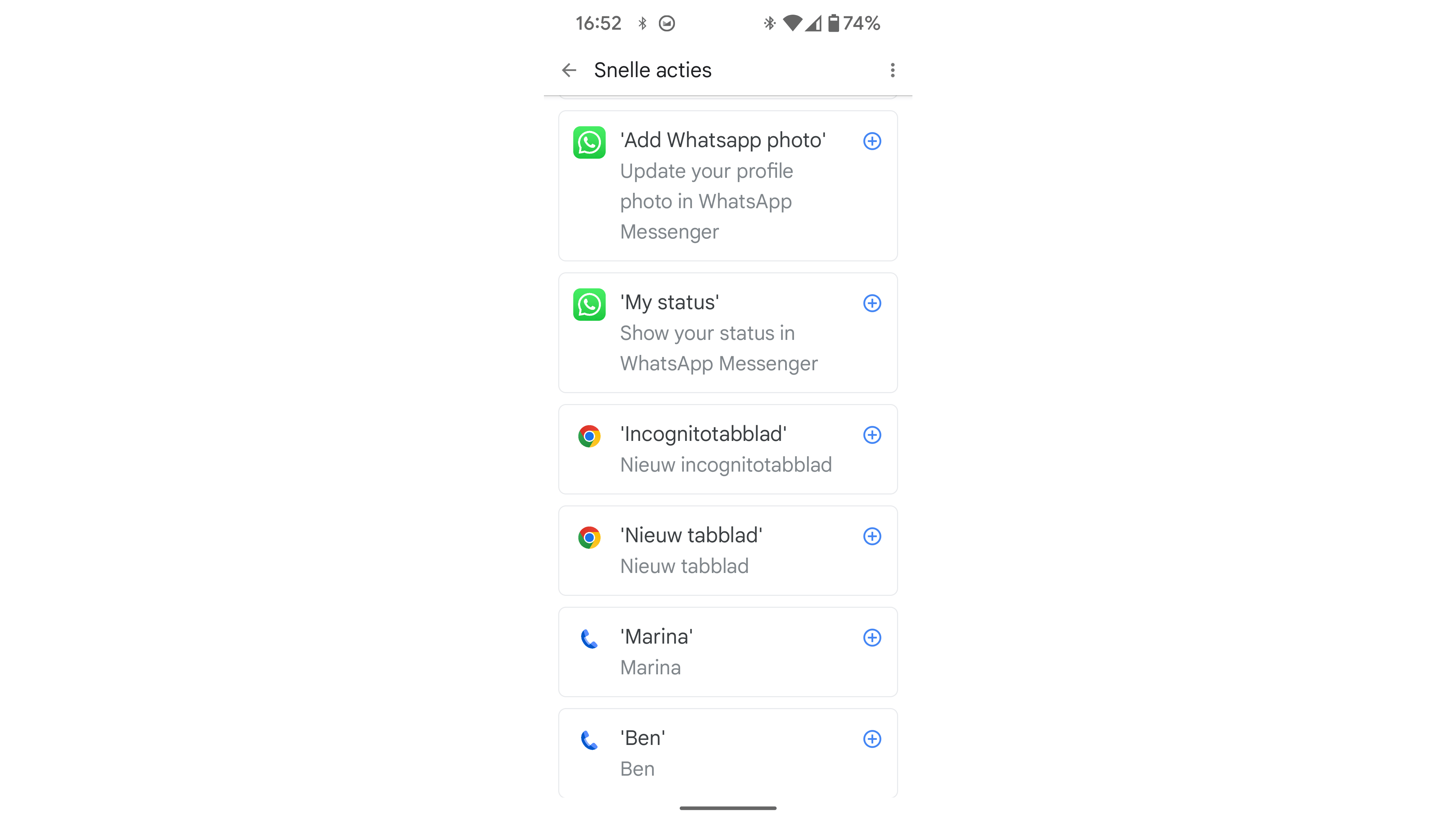 Tik op het plusknopje naast een gewenste actie om deze toe te voegen. Door bijvoorbeeld Nieuw document te activeren, kun je voortaan simpelweg ‘OK Google, Nieuw document’ zeggen om een nieuw document in Google Documenten te openen. De toegevoegde acties vind je op het tabblad Je snelle acties, waar je de spraakcommando’s kunt aanpassen en ongewenste shortcuts ook kunt verwijderen.