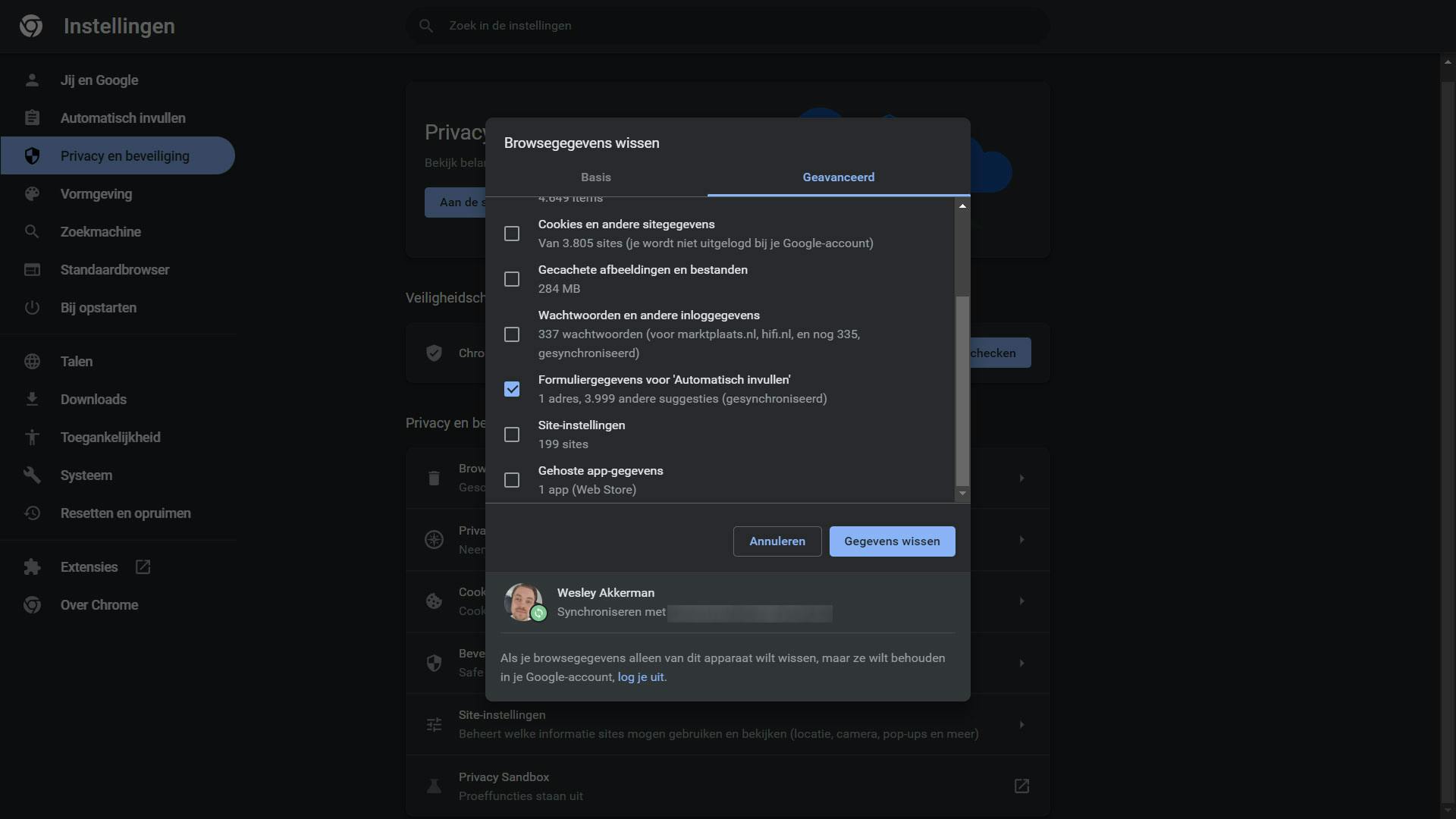 Binnen Google Chrome ga je bijvoorbeeld naar de instellingen van de browser, waar je de opties met betrekking tot Privacy en beveiliging opzoekt. Vervolgens ga je naar Browsergegevens wissen, druk je op Geavanceerd, selecteer je Alles (in het dropdownmenu) en zet je een vinkje bij Formuliergegevens wissen voor Automatisch invullen. Mochten er elders nog wat vinkjes staan, dan haal je die weg, want op dit moment willen we alleen deze specifieke informatie verwijderen. Druk nu op de knop Gegevens wissen en je bent klaar. Alle informatie is dan wel weg; houd daar dus rekening mee.