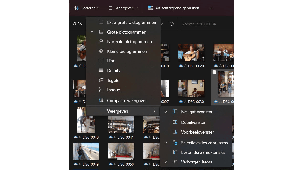Uiteraard weet je dat je meerdere bestanden tegelijk kunt selecteren door de Ctrl-toets in te drukken om de selectiegroep met iedere muisklik uit te breiden. Voortaan kun je in Windows Verkenner ook selectievakjes toevoegen, zodat je nog makkelijker meerdere bestanden tegelijk kunt kiezen zonder de Ctrl-toets in te drukken. Klik in de functiebalk op Weergeven. Daarna selecteer je in de lijst de optie Weergeven, en daar kun je de Selectievakjes voor items activeren.