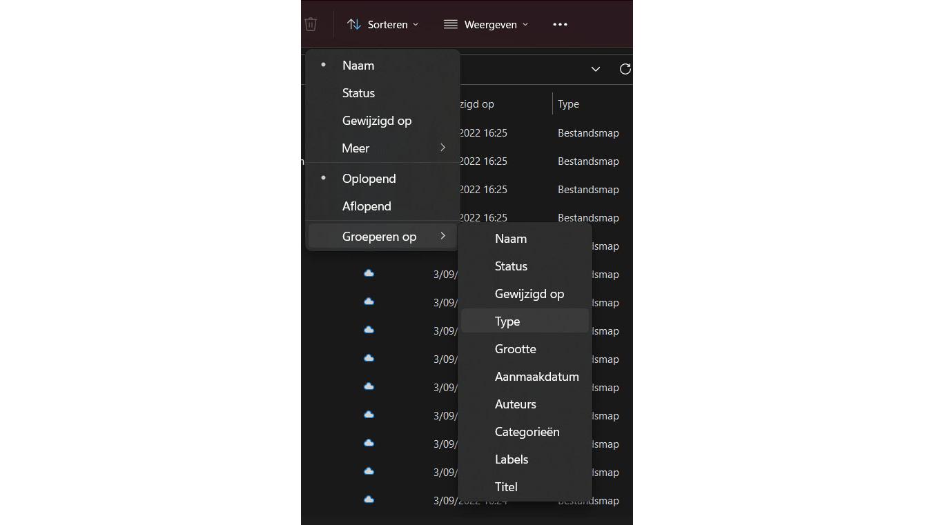 Wil je in een map met heel veel bestanden een rekenblad of presentatie terugvinden, maar weet je niet meer hoe dat bestand heet? Sorteer je bestanden in Verkenner dan op bestandstype. Op die manier zie je bijvoorbeeld meteen alle jpeg-bestanden, alle Word-bestanden en alle PowerPoint-bestanden onder elkaar. Dat maakt het zoeken veel eenvoudiger. Deze functie heet Groeperen en vind je door in de functiebalk op Sorteren te klikken. Daarna ga je naar Groeperen op en kun je verschillende criteria kiezen. Klik bijvoorbeeld op Type om de bestanden volgens bestandsindeling te groeperen. Gaat het om foto’s, dan kun je zelfs op Afmetingen en Waardering sorteren. Als je de standaard bestandsweergave van Windows wilt herstellen, dan gebruik je de optie Gewijzigd op.