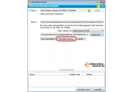 Een van de kleine minpuntjes van GemistDownloader 2.0 was dat u slechts één download tegelijk kon starten. Wanneer u een aantal uitzendingen van bijvoorbeeld Koefnoen wilde downloaden, zat er dus niets anders op dan steeds te wachten tot de uitzending gedownload was om vervolgens de nieuwe download te starten. Mede dankzij deze aanmerking heeft de maker van GemistDownloader een nieuwe batch-optie toegevoegd. Zo kunt u een aantal programma’s klaarzetten in een wachtlijst om ze achter elkaar te downloaden. In plaats van te kiezen voor Start downloaden, klikt u op de knop Toevoegen aan que. Hier wordt natuurlijk ‘queue’ bedoeld (of eigenlijk zelfs wachtrij, aangezien het programma vertaald is), maar goed. Naast deze handige nieuwe optie, zijn er nog veel meer verbeteringen doorgevoerd. Een belangrijke verbetering in deze nieuwe versie van GemistDownloader is dat u de video’s nu ook kunt opslaan met behulp van het H.264-codec. Deze compressiemethode zorgt voor een hoge kwaliteit.