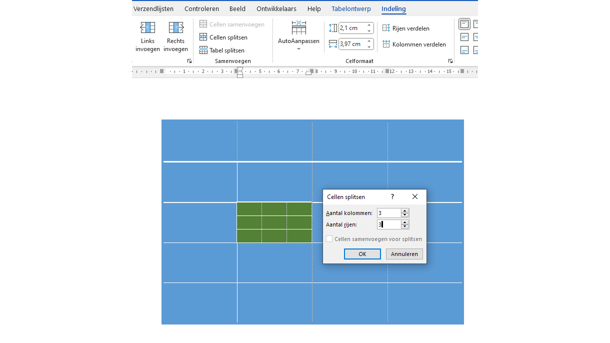 Eerst moet je de primaire tabel selecteren door erop te klikken, zodat de tabelspecifieke tabbladen in het lint verschijnen. Dat zijn de tabbladen Tabelontwerp en Indeling. Om één cel te verdelen in verschillende delen, plaats je de muisaanwijzer in de cel en vervolgens open je het tabblad Indeling. Terwijl de cel nog steeds geselecteerd is, klik je op de knop Cellen splitsen. Er verschijnt een keuzevenstertje waarin je aangeeft hoeveel kolommen en hoeveel rijen je wilt hebben. Voer dit in en klik op OK om te bevestigen. Word zal de cel nu netjes van rand tot rand verdelen in het aantal cellen dat je hebt gekozen. Om de ingebedde tabel vorm te geven, moet je de cellen selecteren, waarna je de achtergrondkleur en de randen kunt wijzigen.