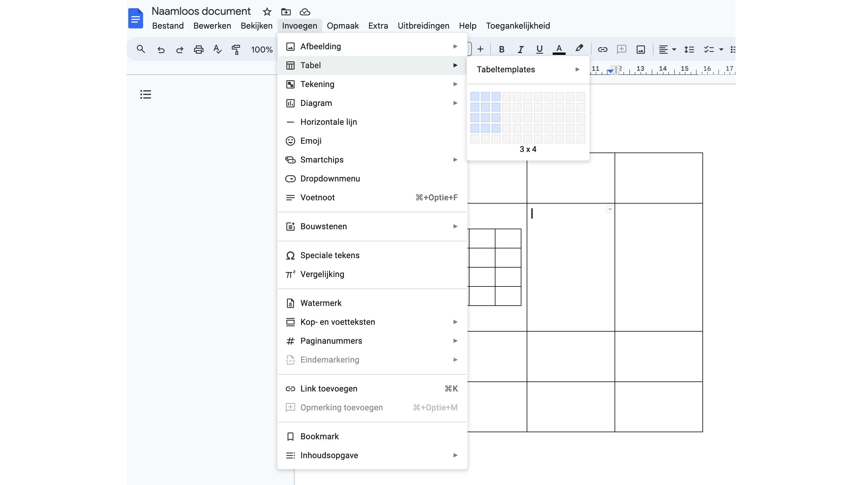Terwijl de eerste manier gaat om celverdeling, kun je ook een nieuwe onafhankelijke tabel in de cel toevoegen. Hiervoor plaats je de muisaanwijzer in de bedoelde cel en ga je naar het tabblad Invoegen. Daar klik je op de optie Tabel. Vervolgens selecteer je in een rooster het aantal kolommen en rijen dat je nodig hebt. Als je deze optie kiest, kun je het geneste raster als een zelfstandige tabel aanpassen, maar deze tabel sluit niet automatisch aan de randen aan. Daarvoor klik je op de kleine tabel, waarna er tabelverplaatsingsgrepen verschijnen (het plusteken met pijlen aan de uiteinden).