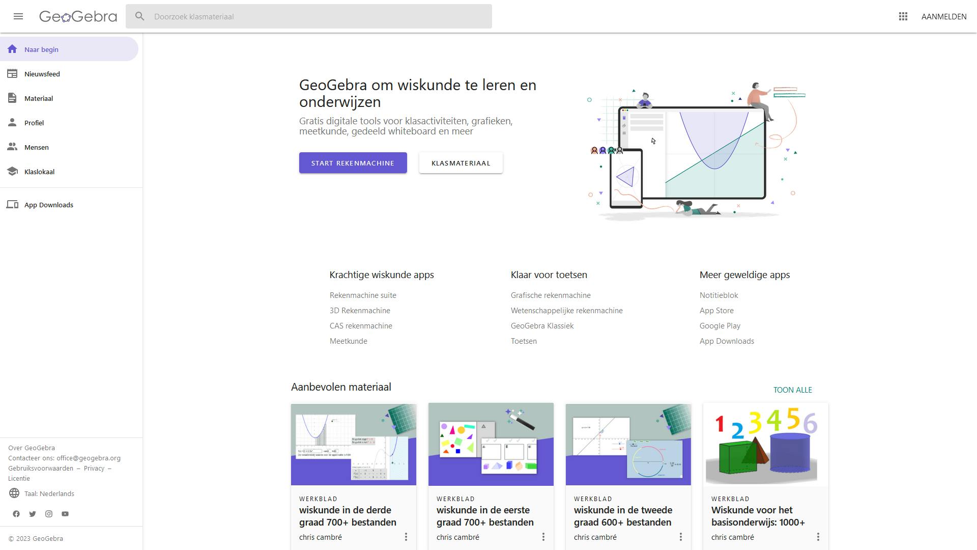 Daarnaast vind je op de hoofdpagina links naar GeoGebra Klassiek, de oorspronkelijke combinatie van meetkunde en algebra, het onderdeel Meetkunde, dat zich specifiek richt op het oplossen van meetkundige vraagstukken en het Notitieblok, waarmee je illustraties kunt maken.