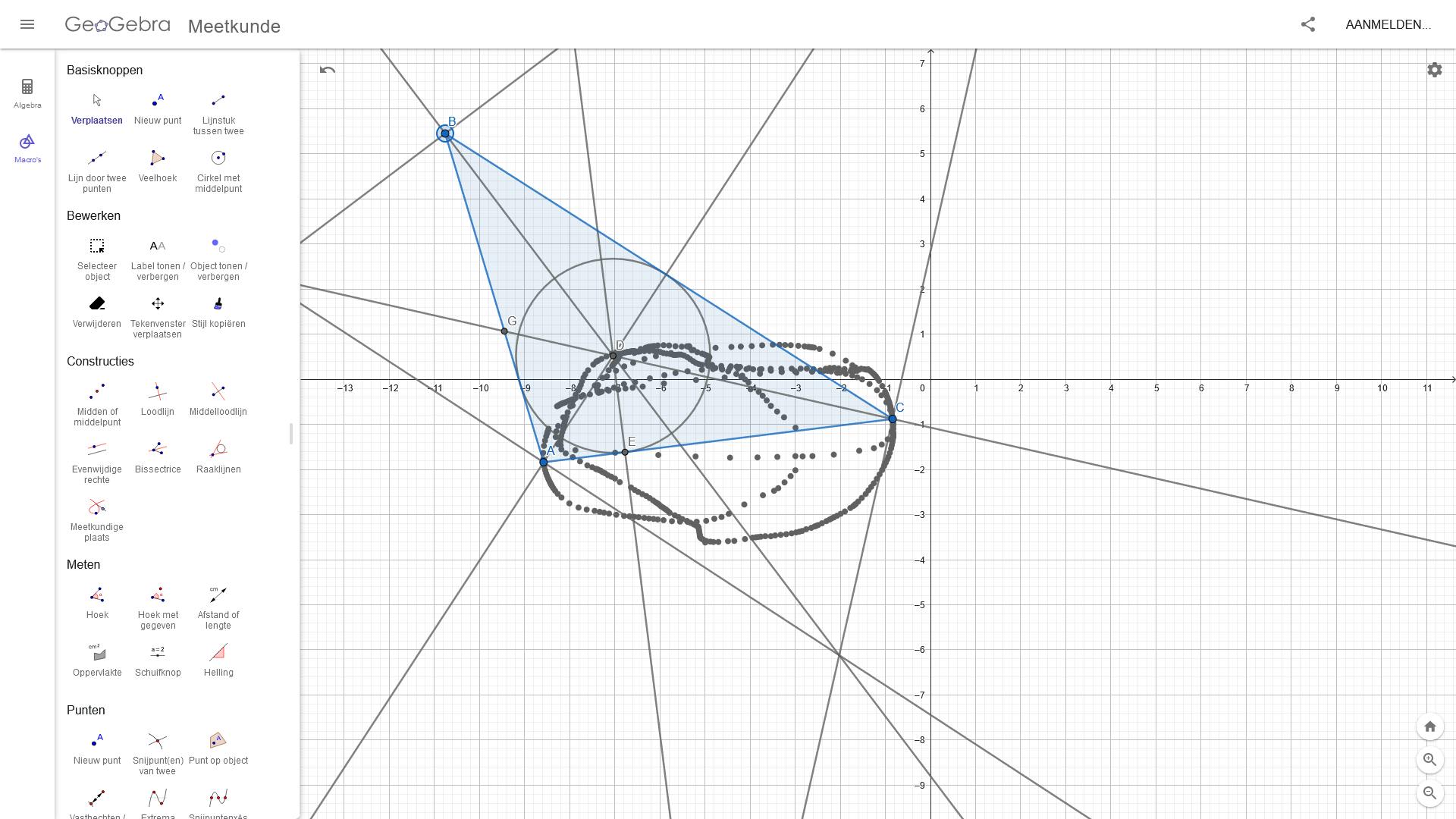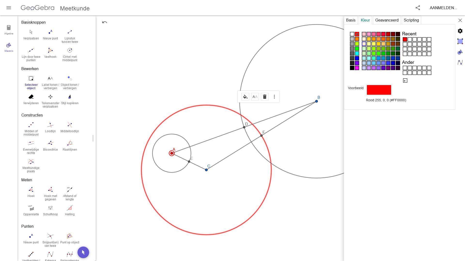 Klik je onder Basisknoppen op Verplaatsen, dan kun je elk van de oorspronkelijke (blauwe) punten verslepen. Daarbij blijven de eigenschappen van je constructie in stand. De cirkel door E met middelpunt A blijft dus door E gaan, ook als je A verplaatst.