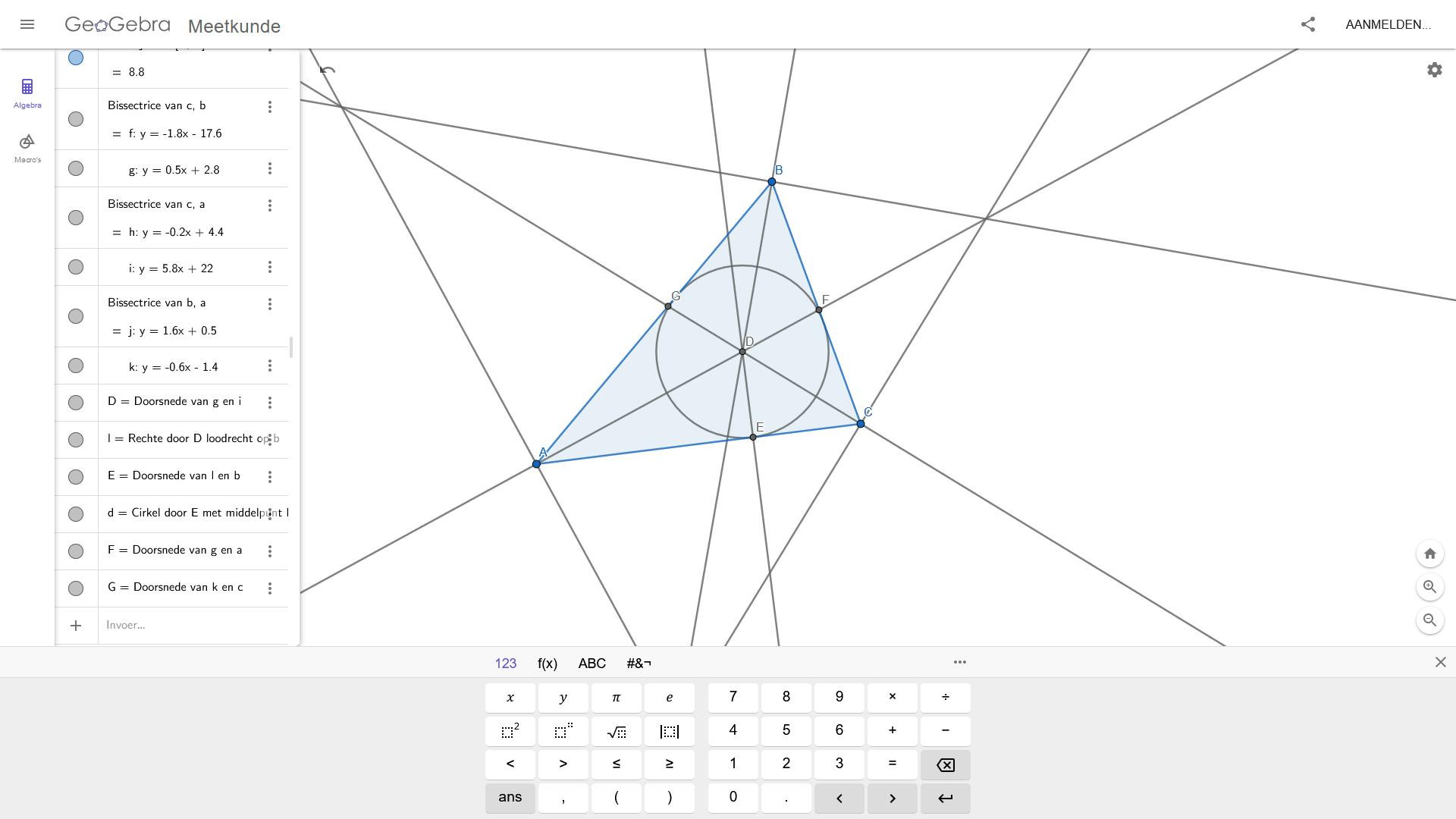Uiterst links is standaard het tabblad Macro’s geselecteerd, waarin je de elementen voor je constructie kunt kiezen, aanpassen en verwijderen. Daarnaast is er het tabblad Algebra. Die naam is op het eerste gezicht wat verwarrend, want wat je er ziet is de geschiedenis van een constructie die je hebt gemaakt. Helemaal onderaan zie je ook een zwart pictogram in de vorm van een klein toetsenbord. Daarmee open je een toetsenbord met meerdere tabs waarmee je berekeningen en allerlei geavanceerde functies aan je constructie kunt toevoegen. Klik daarvoor op de drie puntjes boven het toetsenbord. Je ziet dan een helpfunctie met alle concepten die het programma kent. Klik je op een concept, dan verschijnen links daarvan één of meer commando’s. Klik je daarop, dan wordt of worden deze aan je lijst met constructiestappen toegevoegd.