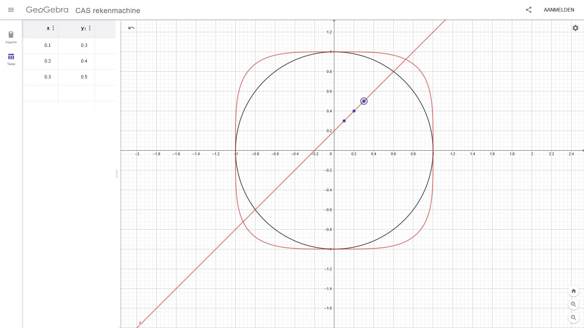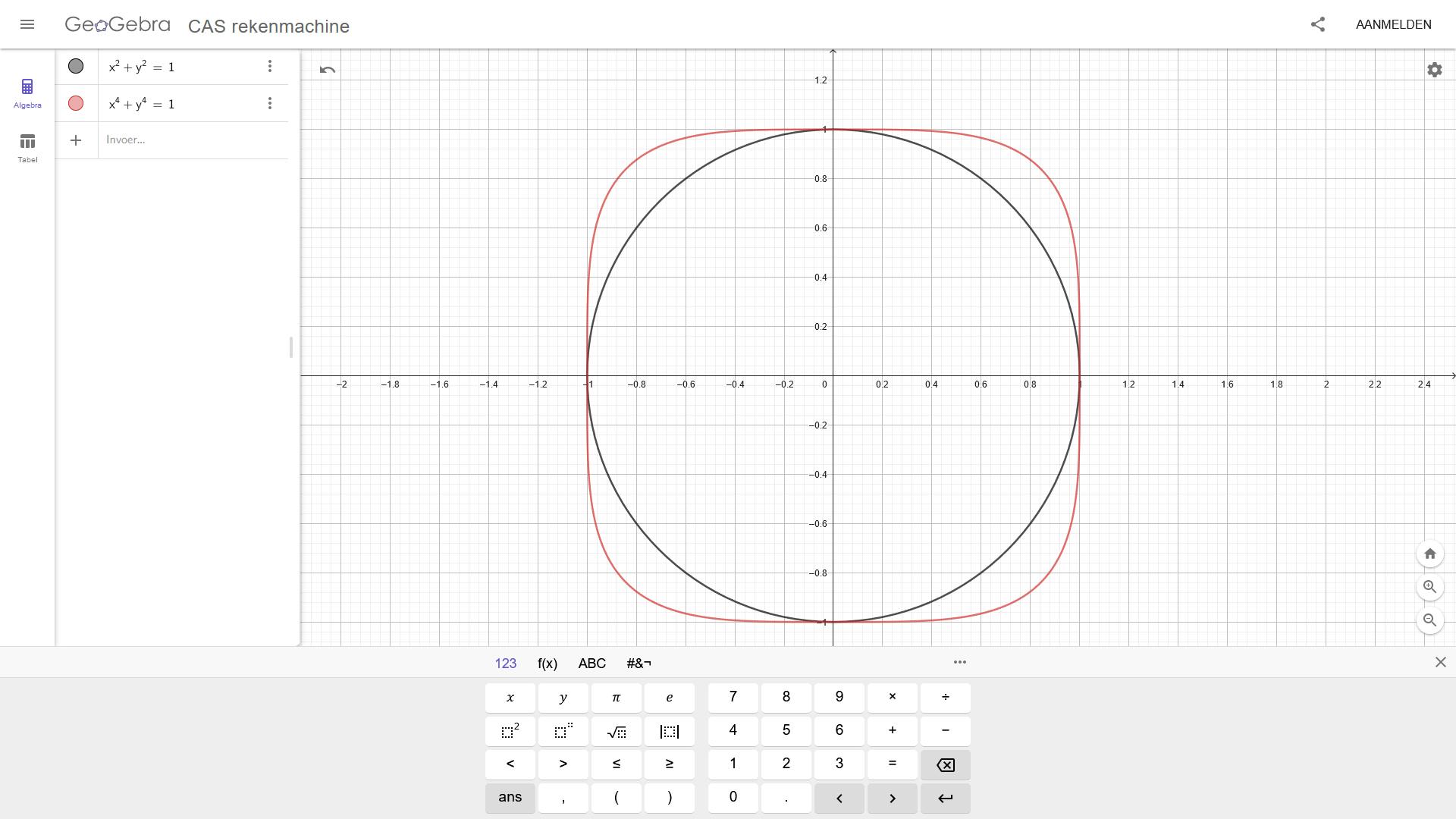 Links zie je de formule die je hebt ingevoerd (de impliciete vergelijking voor een cirkel). Klik op de drie puntjes erachter en kies Dupliceer invoer. Klik op de tweede formule en verander beide kwadraten in een 4. Na een druk op Enter wordt de nieuwe grafiek getekend die het midden houdt tussen een vierkant en een cirkel. Klik op deze grafiek en klik op het Kleur-pictogram (verf-emmertje). Klik op rood en vervolgens op een lege plek en je hebt twee verschillend gekleurde grafieken.