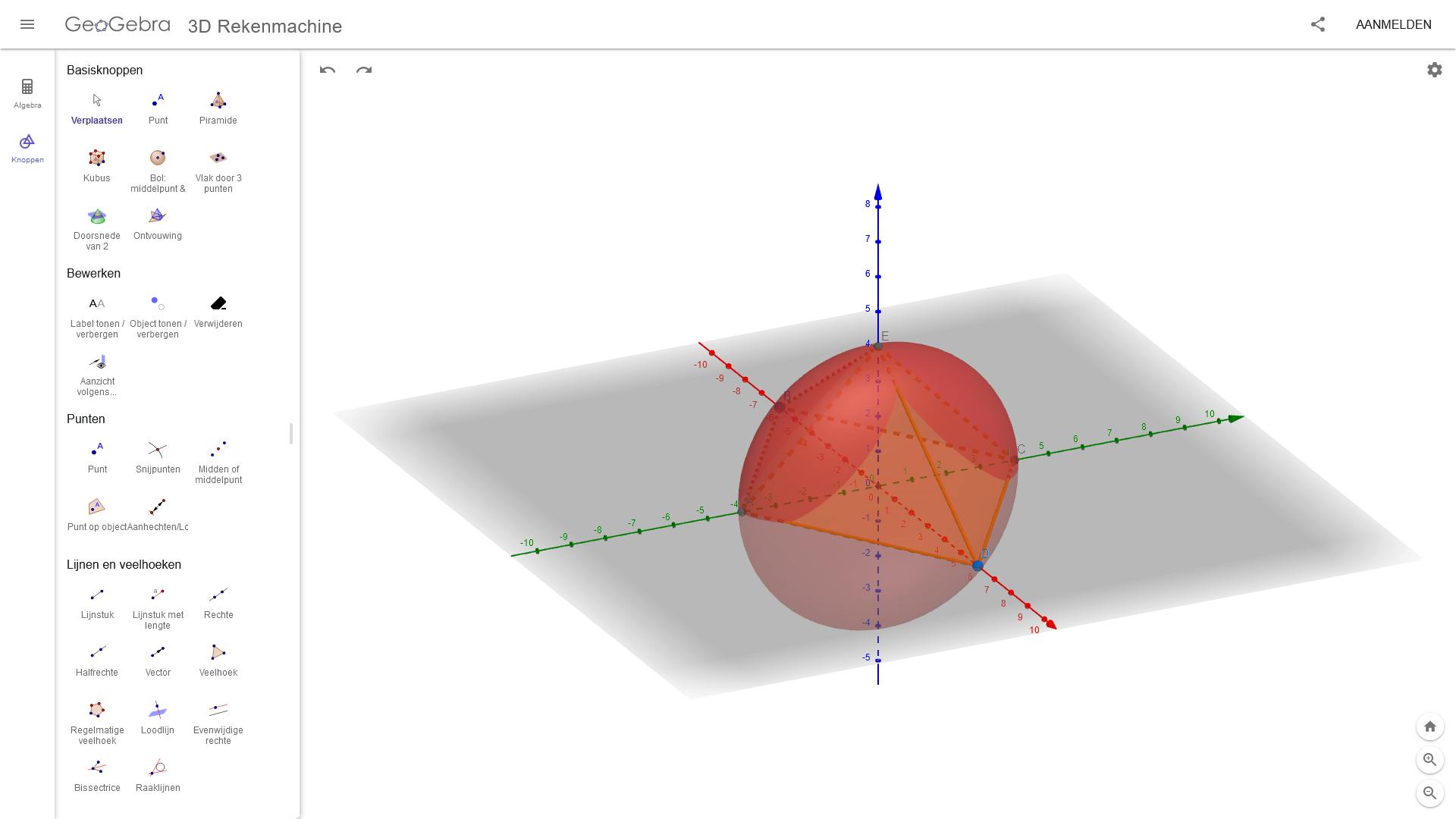 In de 3D Rekenmachine kun je niet alleen grafieken maken op basis van formules. In het tabblad Knoppen vind je namelijk ook allerlei objecten. Om ze allemaal te zien, moet je op Meer klikken. Klik bijvoorbeeld op Piramide, klik vervolgens op vier punten op de x- en y- as (in het grondvlak, bijvoorbeeld (4,0,0), (0,6,0), (-4,0,0) en (0,-6,0)). Klik tot slot op de z-as op het punt (0,0,4) en daar is je piramide.