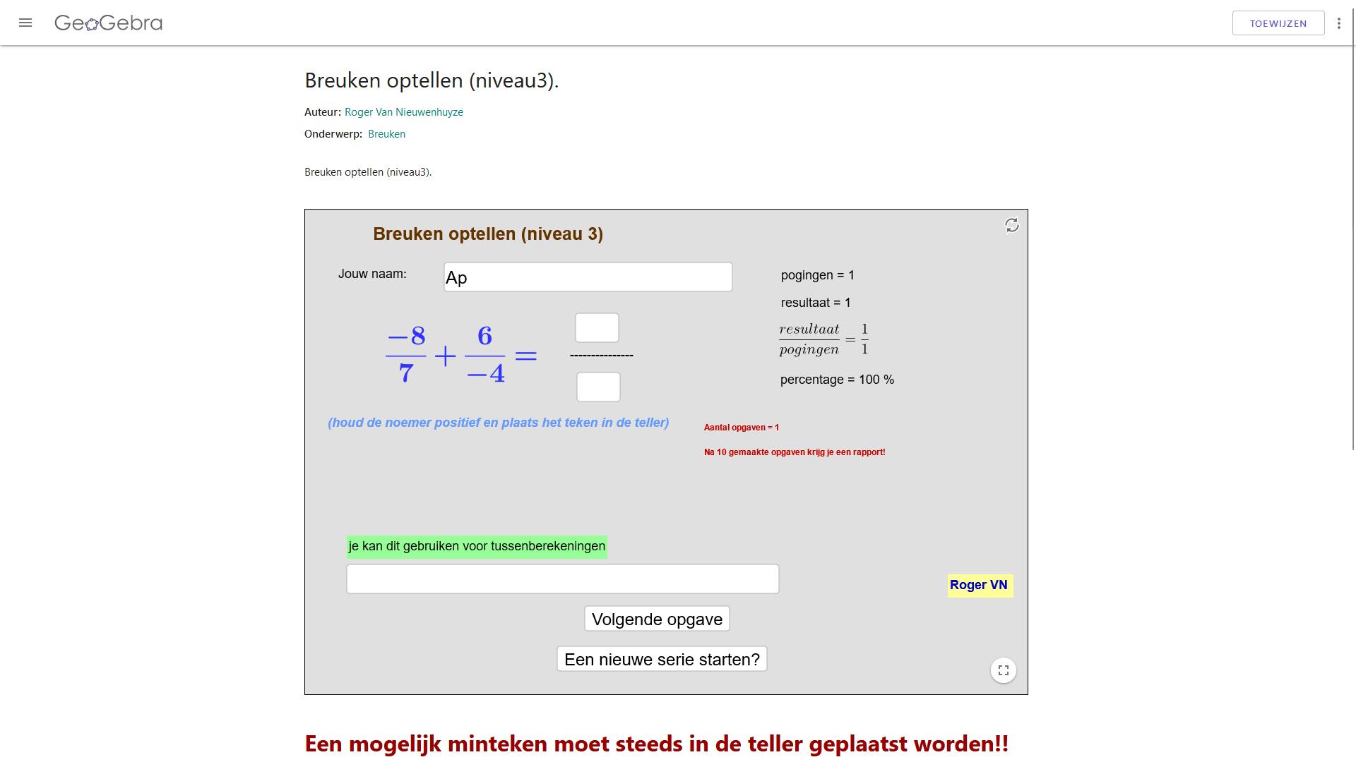 Onder de voorbeelden onder Aanbevolen materiaal (verdeeld over verschillende niveaus), vind je een zoekboom waarmee je door verschillende disciplines binnen de wiskunde kunt bladeren. Klik bijvoorbeeld op Algebra. Zoals je ziet, kun je ook daarbinnen weer navigeren, bijvoorbeeld door te klikken op Breuken. Je ziet nu alle openbare bestanden binnen dat thema. We openen Breuken optellen (niveau 3). Dit werkblad is een typisch voorbeeld van een overhoring en daarom kun je het niet aanpassen. Er zijn ook vele werkbladen waar je wel onder de motorkap kunt kijken om meer de leren over de vele mogelijkheden van GeoGebra.