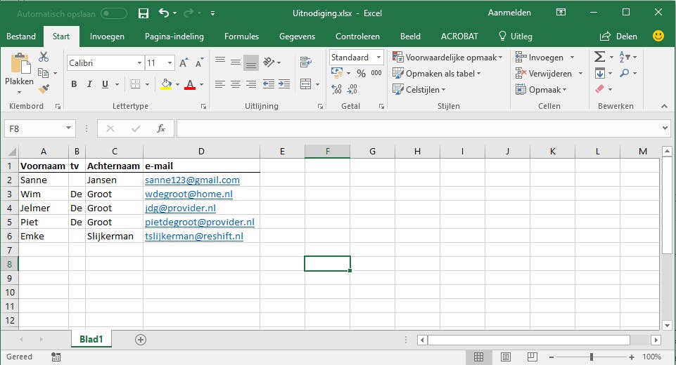 Om te beginnen maak je in Excel een lijst met voor- en achternamen en uiteraard de e-mailadressen. Zorg dat je hierbij kolomtitels gebruikt, dat maakt het zo dadelijk veel overzichtelijker. We gaan er eerst even van uit dat je iedereen met de voornaam aanspreekt, in het tweede deel van dit artikel lees je hoe je onderscheid maakt tussen personen en gezinnen (voornaam of familie+achternaam). Onthoud de naam van het tabblad (onder in beeld), sla het Excel-bestand op en sluit het.