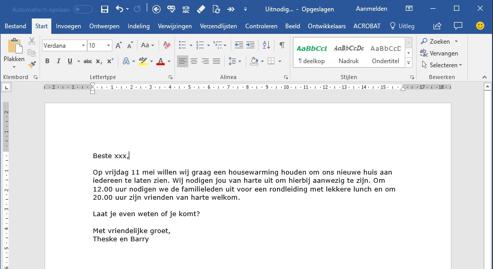 Als je een hoop mensen wilt uitnodigen voor een groot feest, dan kan dit gemakkelijk via e-mail. Het is dan wel leuk als iedereen een eigen mailtje ontvangt met persoonlijke aanhef. We gaan in deze cursus uit van het voorbeeld van een housewarming. We gaan eerst uit van een algemene mail met alleen een aangepaste aanhef. Weet je daarna hoe het werkt, dan leggen we ook uit hoe je kunt zorgen dat bijvoorbeeld familieleden voor de middag worden uitgenodigd en vrienden voor de avond.