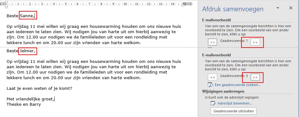 In Stap 5 zie je een voorbeeld: in het bericht is na ‘Beste’ de eerste naam ingevuld. Door op de pijltjes te klikken, kun je de voorbeelden met de volgende namen bekijken. Klik op Volgende: Samenvoeging voltooien.