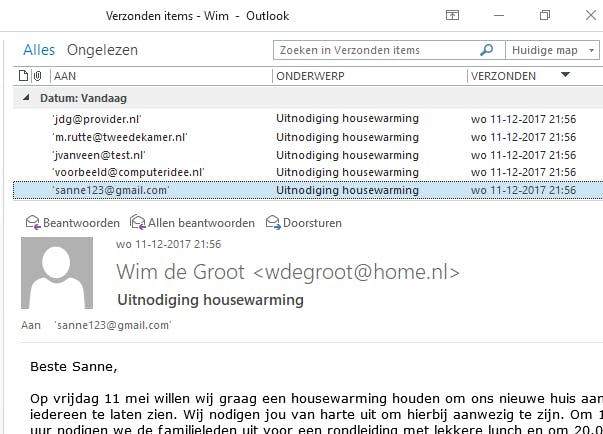 Zorg dat Outlook opgestart is en schakel weer terug naar Word. Klik in stap 6 onder Samenvoeging voltooien op Elektronische post. Het venster Samenvoegen per e-mail verschijnt. Laat bovenaan bij Aan de keuze op email staan. Vul bij Onderwerpregel het onderwerp van je e-mail in, bijvoorbeeld: Uitnodiging housewarming, dit onderwerp krijgt iedereen te zien. Laat de optie E-mailindeling op HTML staan en laat de optie onder Records verzenden staan op Alles. Klik op OK en dan gebeurt het wonder: je ene bericht wordt steeds van een andere naam voorzien en aan iedereen als persoonlijke e-mail verzonden. Als je overschakelt naar Outlook en de map Verzonden items kiest, zie je alle e-mails langskomen!