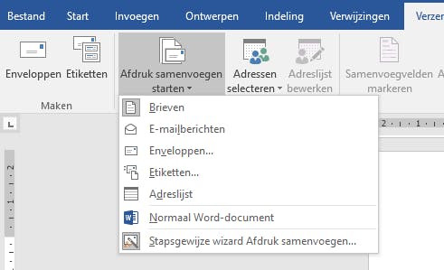 Ga naar het bericht in Word. Klik op de tab Verzendlijsten, klik op Afdruk samenvoegen starten / Stapsgewijze wizard Afdruk samenvoegen (onder in dat menu). Rechts in beeld gaat een taakvenster open: daarin zie je onderaan in welke stap je bent. Je kunt altijd terug naar een vorige stap als je nog iets wilt wijzigen of te snel doorgeklikt hebt.