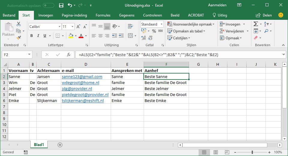Boven kolom F zet je het kopje Aanhef. We laten het ‘berekenen’ van de aanhef aan een formule over. Zet in cel F2 de formule: