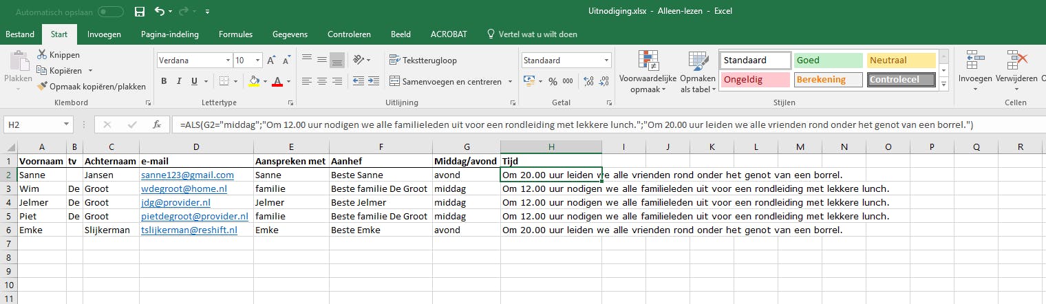 We maken twee nieuwe kolommen aan in ons Excelbestand. Kolom G geven we de titel Middag/avond en kolom H krijgt de titel Tijd. In kolom G voer je nu bij iedere genodigde in of hij voor de middag of de avond is uitgenodigd. Onder Tijd gaan we een formule gebruiken die de juiste zin in het Word-bestand gaat plaatsen: