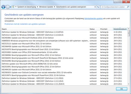 Een overzicht van aangebrachte updates is op te vragen door op de Windows-knop te drukken (of links onderin te klikken op het Windows-logo) en dan te gaan naar Configuratiescherm / Systeem en beveiliging / Windows Update. Op dit scherm ziet u meteen of er nog updates zijn die nog op het systeem moeten worden aangebracht en ook wanneer er voor het laatst naar updates is gezocht. Onder het kader klikt u op de link Geschiedenis van updates weergeven om een overzicht te krijgen van updates die momenteel op het systeem aanwezig zijn. U ziet precies wat er is geïnstalleerd, op welke datum dat was, de prioriteit per update en of het installeren ook echt gelukt is.
