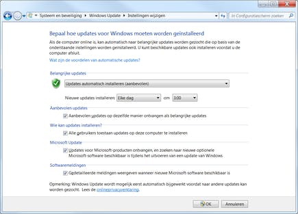 Soms mislukt het aanbrengen van een update, maar als het goed is moet het kort daarna dan alsnog succesvol zijn afgerond. Benieuwd waarom een bepaalde update nodig was? Dubbelklik op de regel en in een nieuw venster verschijnt een korte uitleg met de reden en nog wat andere informatie. Sluit het extra venster en klik op OK om terug te keren naar het scherm Windows Update. Om grip te krijgen op hoe en wanneer updates aangebracht worden, klikt u in de linker kolom op Instellingen wijzigen. Behalve een dag en tijdstip uitzoeken, kunt u ook aangeven of het proces volledig automatisch mag plaatsvinden, of dat u per keer een fiat wilt geven voor het downloaden en/of het installeren van de updates.