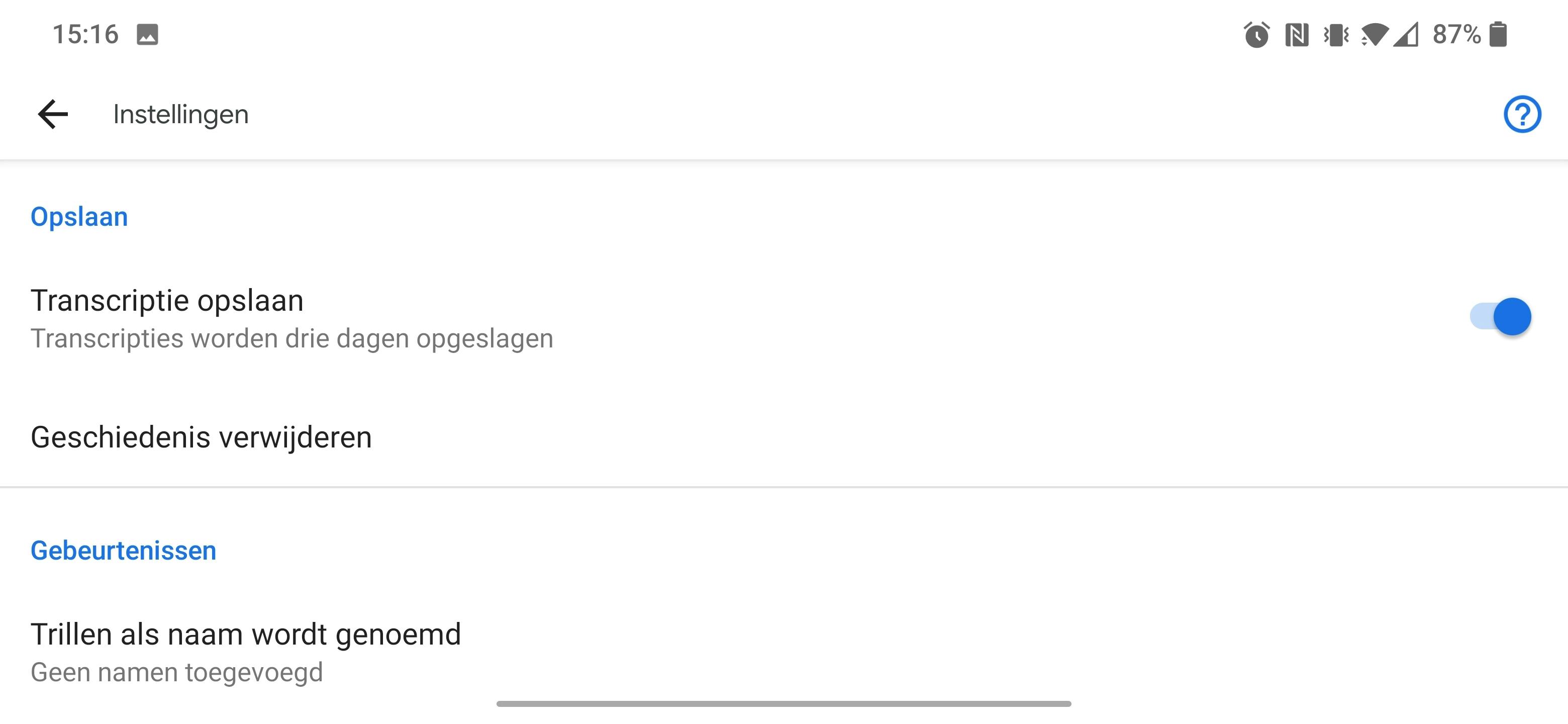 Nu je toch in de app-instellingen zit, activeer dan bij het onderdeel Opslaan meteen even de optie Transcriptie opslaan. Vanaf dat moment blijft alle herkende tekst maximaal drie dagen beschikbaar in de app.