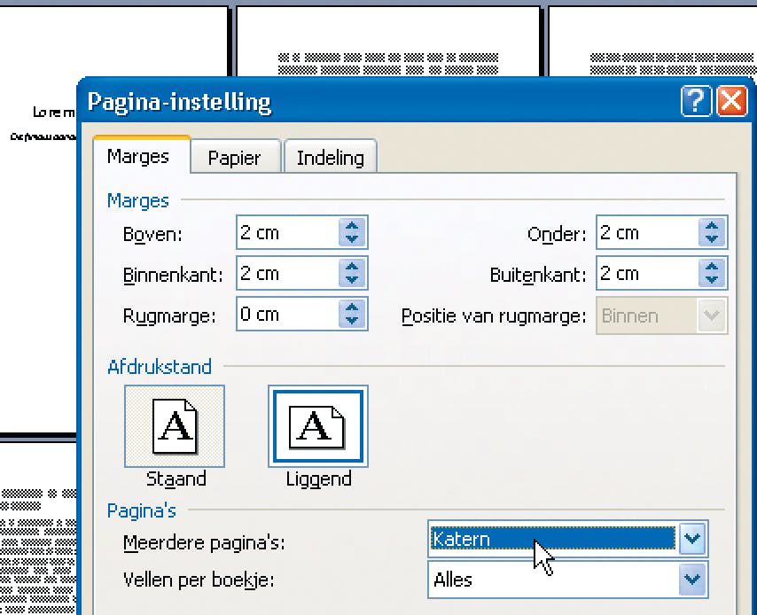 Nu komt het punt waar alles om draait. Klik op Bestand, Pagina-instelling; er gaat een venster open (in Word 2007 klikt u hiervoor op het tabblad Pagina-indeling op het diagonale pijltje rechts onder in de groep Pagina-instelling). Kies met de keuzelijst Meerdere pagina's voor Katern; de Afdrukstand wordt automatisch Liggend. Stel op dit tabblad de marges van Boven en Onder, Binnenkant en Buitenkant in op 2 cm. Bij Binnenkant regelt u de afstand vanaf het midden (links en rechts van de vouw), Buitenkant staat voor de marges links en rechts zoals die op het vel papier worden afgedrukt.