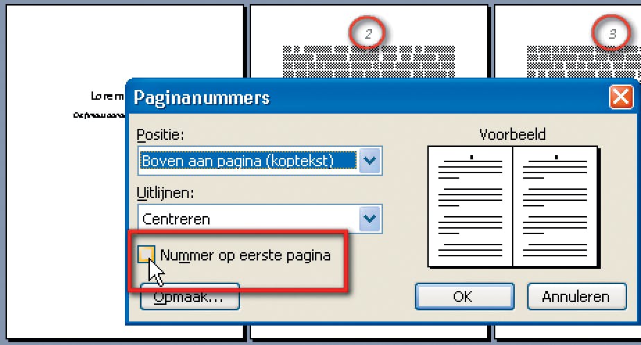 Het is handig om paginanummers aan te brengen. Dan ziet u meteen aan de hand van het inslagschema (daarover straks) hoe de pagina's op hun plaats vallen en of ze goed worden afgedrukt. Klik hiervoor op Invoegen, Paginanummers. Er hoeft geen nummer op de voorkant, dus u schakelt Nummer op eerste pagina uit. Word 2007: klik in het tabblad Invoegen op Paginanummer en kies met het menu waar u het nummer wilt hebben; het tabblad Ontwerpen gaat vanzelf open, daarin schakelt u Eerste pagina afwijkend in.