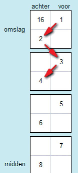 Op een vel A4 komen op één kant van het papier steeds twee tegenover liggende pagina's A5. U hoeft zich er niet om te bekommeren welke pagina's op een vel papier naast elkaar worden afgedrukt; dat regelt Word voor u. Maar als u een belangrijk verhaal precies op de middenpagina's wilt hebben (als een zogeheten spread), is het wel handig om te weten welke paginanummers het midden vormen. Hiervoor tekent u een tabel met de paginanummers, een zogeheten inslagschema. Rond het aantal pagina's van uw boekje naar boven af op een veelvoud van vier, bijvoorbeeld zestien. Teken een tabel met twee kolommen. Het aantal vakjes onder elkaar is de helft van het afgeronde getal (acht vakjes in dit voorbeeld). Noteer in het vakje rechtsboven een 1, daar komt altijd de titelpagina. Het vakje ernaast is de laatste bladzijde, noteer daar 16. Vanaf pagina 1 nummert u zigzag naar beneden. U komt vanzelf links onder in de tabel, dat paginanummer is altijd de helft van het totaal (pagina 8 in ons voorbeeld). Noteer rechtsonder het volgende paginanummer; deze beide pagina's vormen het middenblad. En nummer al zigzaggend naar boven de andere vakjes. Twee vuistregels ter controle: alle even pagina's staan links. En twee cijfers naast elkaar vormen altijd het aantal pagina's plus 1; dus in ons voorbeeld is de optelsom overal 17.