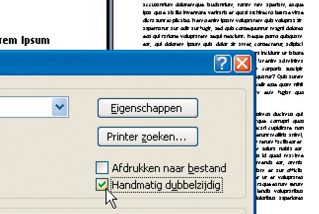 En dan is het tijd om uw boekwerkje af te drukken. Eerst bedrukt u de ene kant van de vellen A4-papier, daarna de andere kant. Leg het juiste aantal vellen papier in de printer. Neem niet meer vellen dan u nodig hebt, zo voorkomt u vergissingen. U neemt het totale aantal pagina's A5 gedeeld door 4 (afgerond naar boven). Voor een boekje van bijvoorbeeld elf pagina's legt u dus drie vellen in de printer. Klik op Bestand, Afdrukken (Word 2007: klik op de Office-knop en op Afdrukken). Of druk op de sneltoets Ctrl + P. Het venster met afdrukopties gaat open. Schakel de optie Handmatig dubbelzijdig in (we gaan ervan uit dat uw printer die optie heeft). Controleer of bij Afdrukbereik Alles staat en klik op OK.