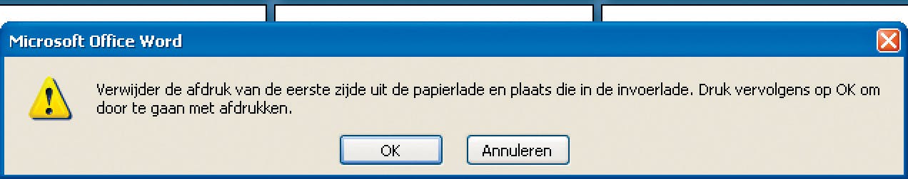 Het afdrukken begint. Met de optie Handmatig dubbelzijdig worden de vellen aan één kant bedrukt. Is dat gebeurd, dan verschijnt er een venster met de melding dat u het papier moet omdraaien en opnieuw invoeren. U hebt rustig de tijd om de stapel opnieuw in te voeren, de printer gaat pas door als u op OK klikt.