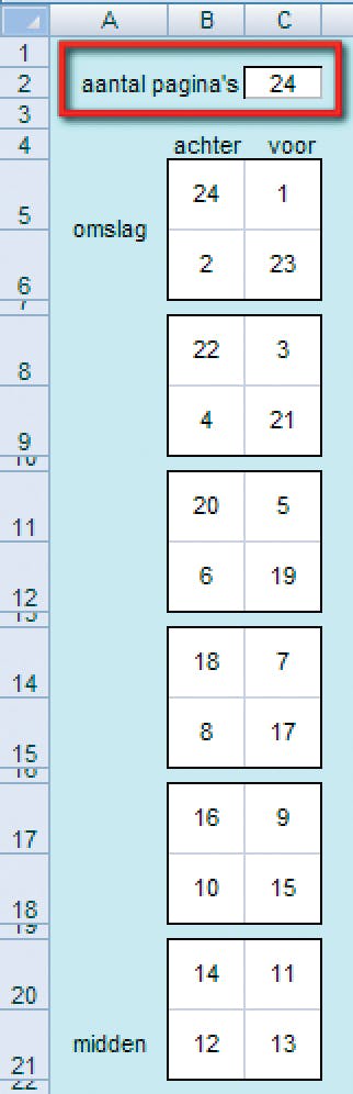U hoeft niet zelf aan de slag om een inslagschema op te stellen, want wij hebben zo'n schema voor u klaargezet. Klik hier om het gratis Excelbestand CID Inslagschema A5.xls te downloaden. Typ in het witte vakje uw aantal pagina's en u krijgt meteen te zien hoe die over de vellen papier worden verdeeld.